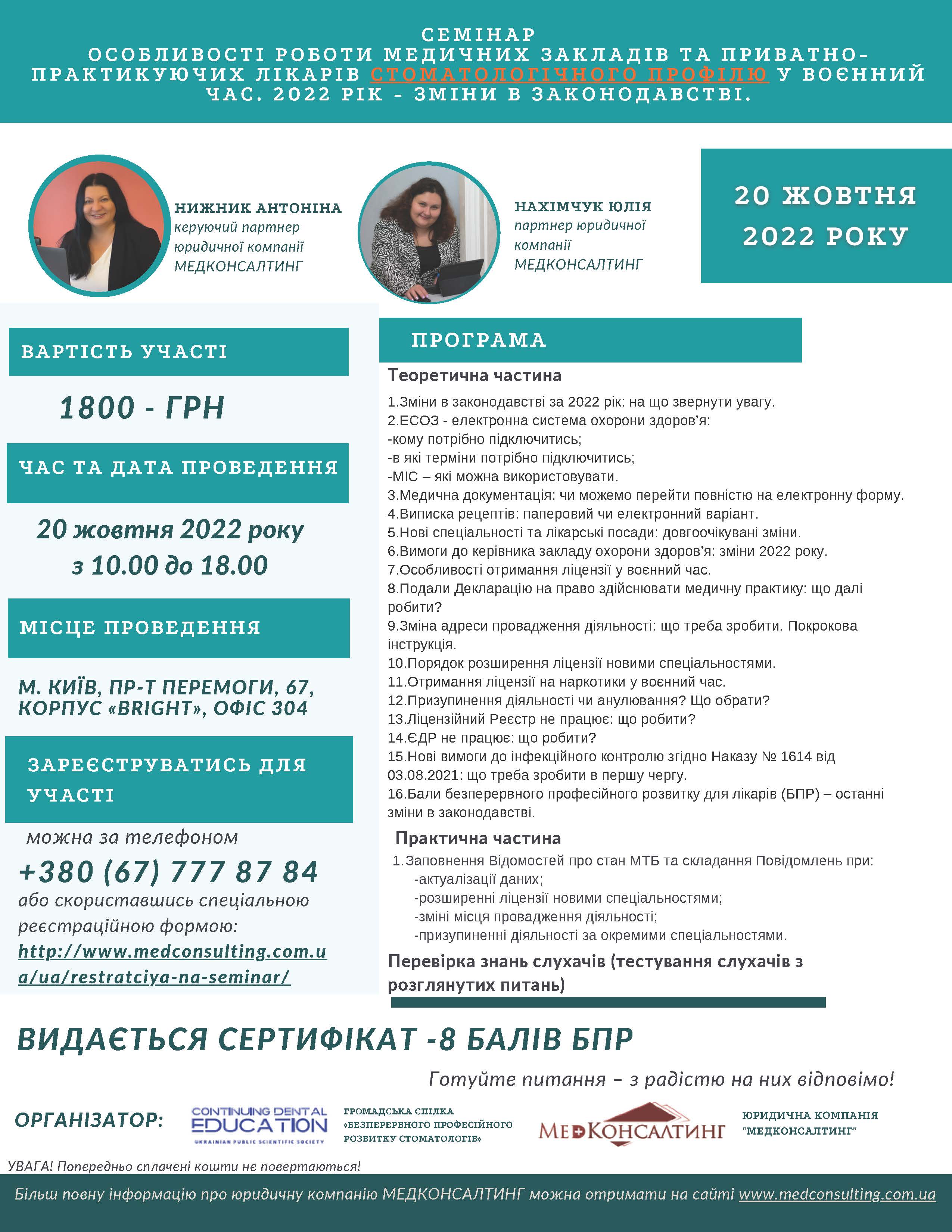 20.10.2022. Семінар: Особливості роботи медичних закладів та приватно-практикуючих лікарів стоматологічного профілю у воєнний час. 2022 рік - зміни в законодавстві