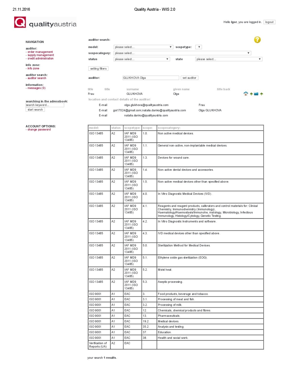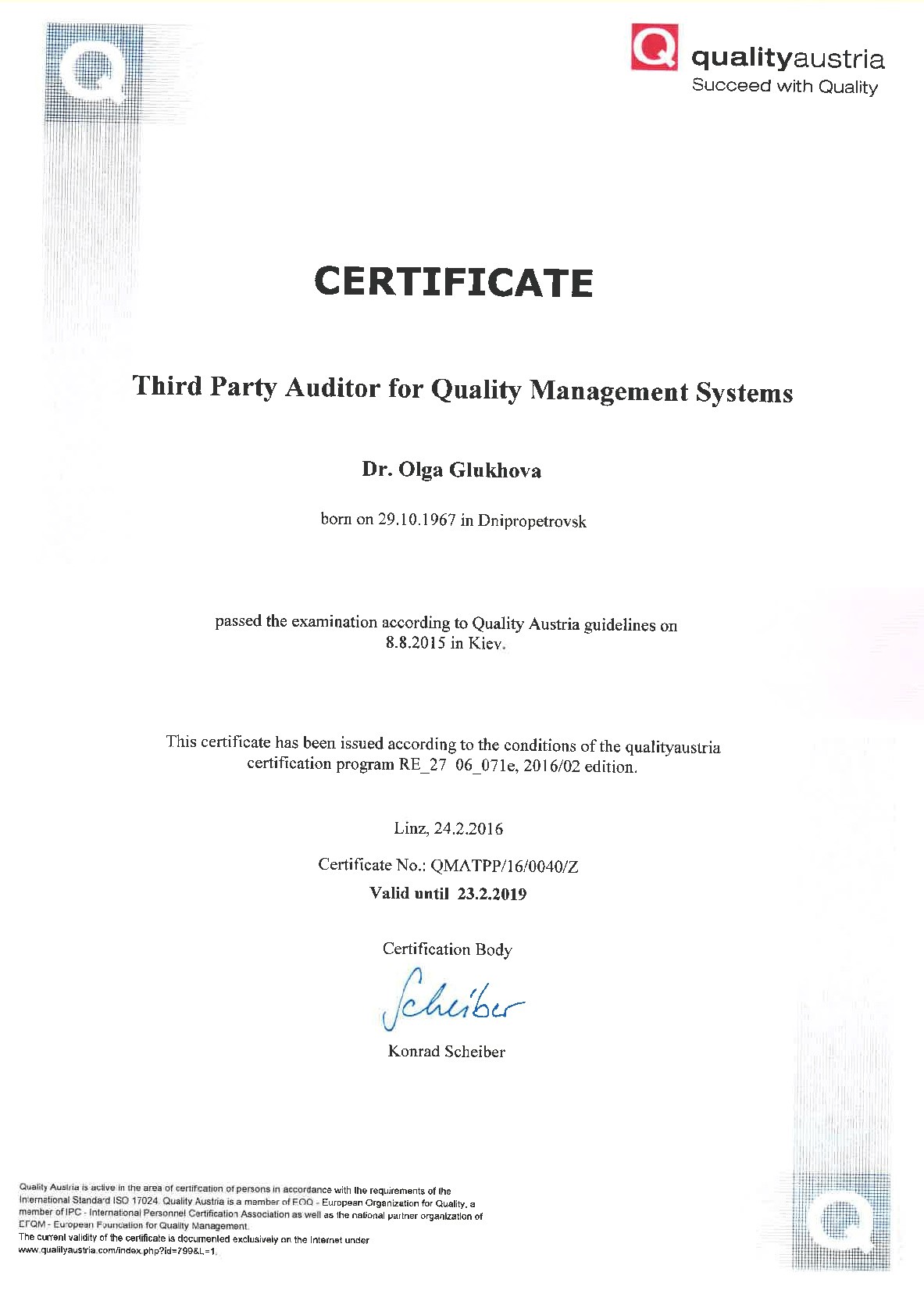 Але, як я вже писала, аудитор може продемонструвати замовникові аудиту, використовуючи свої можливості (логіни та паролі) для входу в інформаційну систему органу з сертифікації, інформацію про свій статус. І тоді замовник в режимі on-line може побачити повну інформацію про аудитора. Як наприклад ту, що наведена нижче (витяг з бази Quality Austria про статус аудитора Глухової Ольги)